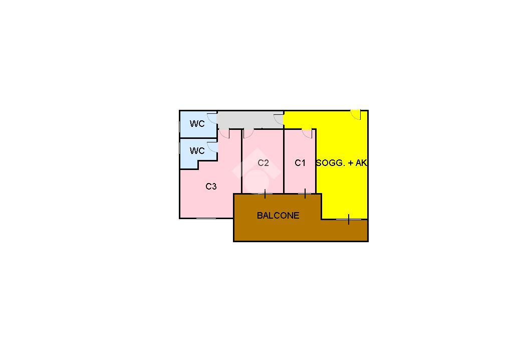 La soluzione è suddivisa in soggiorno con angolo cottura con uscita diretta sul balcone, due camere da letto anch'esse con uscita sul balcone, una terza camera, due bagni finestrati con doccia.